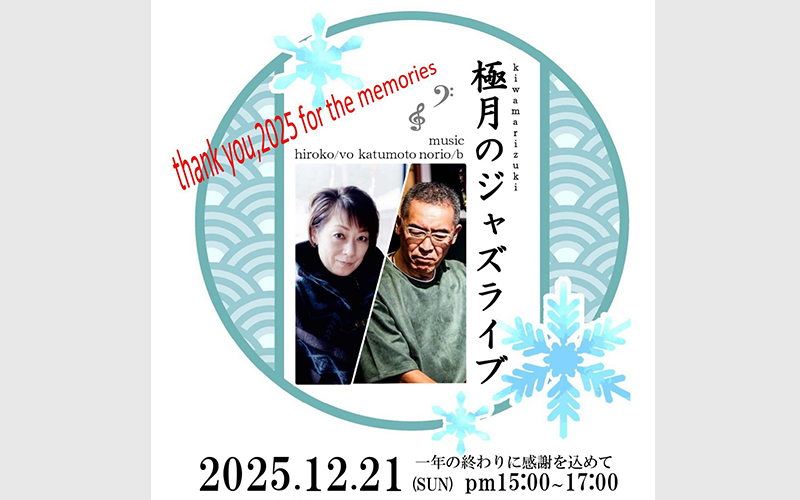 2025年も残すところ一ヶ月足らず。皆様への一年の感謝の気持ちを込めて、極上のジャズライブ&ディナー会を開催します。おなじみのhirokoさんのボーカルとkatsumotoさんのベースが奏でる大人のジャズを聴きながら、フードとフリードリンクを贅沢に心ゆくまでお楽しみいただけます[続きを読む]