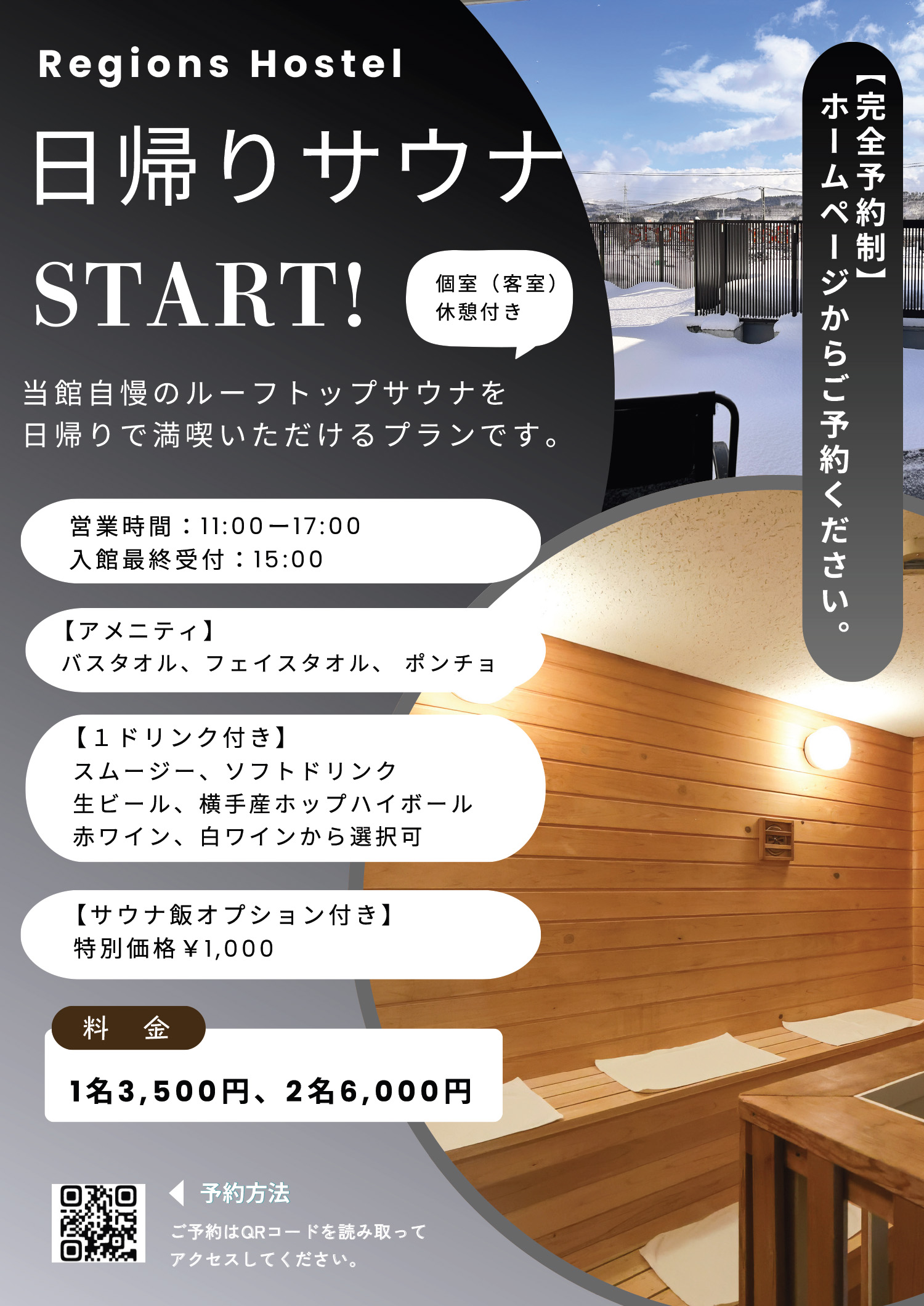 ただ今、リージョンズホステルのプライベートサウナのご利用に「秋田 冬アソビ割」が適用されおり、通常12,000円のところを、2月28日(土)まで最大半額でお楽しみいただけます!!