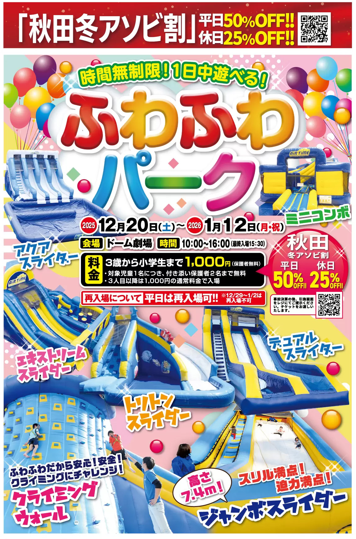 1月12日(月・祝)まで、ドーム劇場に巨大なエア遊具を集合させた「ふわふわパーク」が秋田ふるさと村で開催中です!!