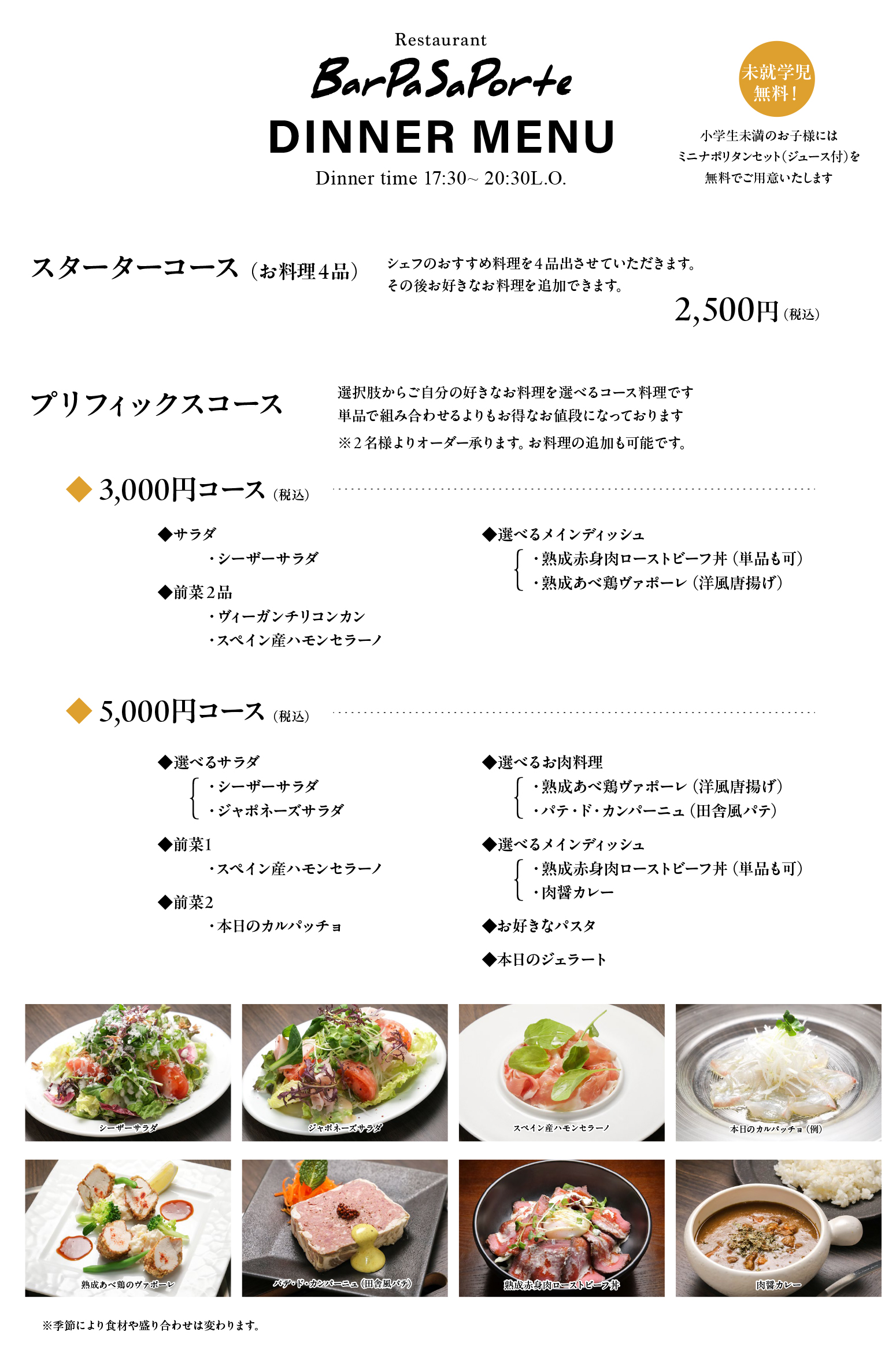 | ディナー/ | 17:30〜20:30ラストオーダー 21:30クローズ |