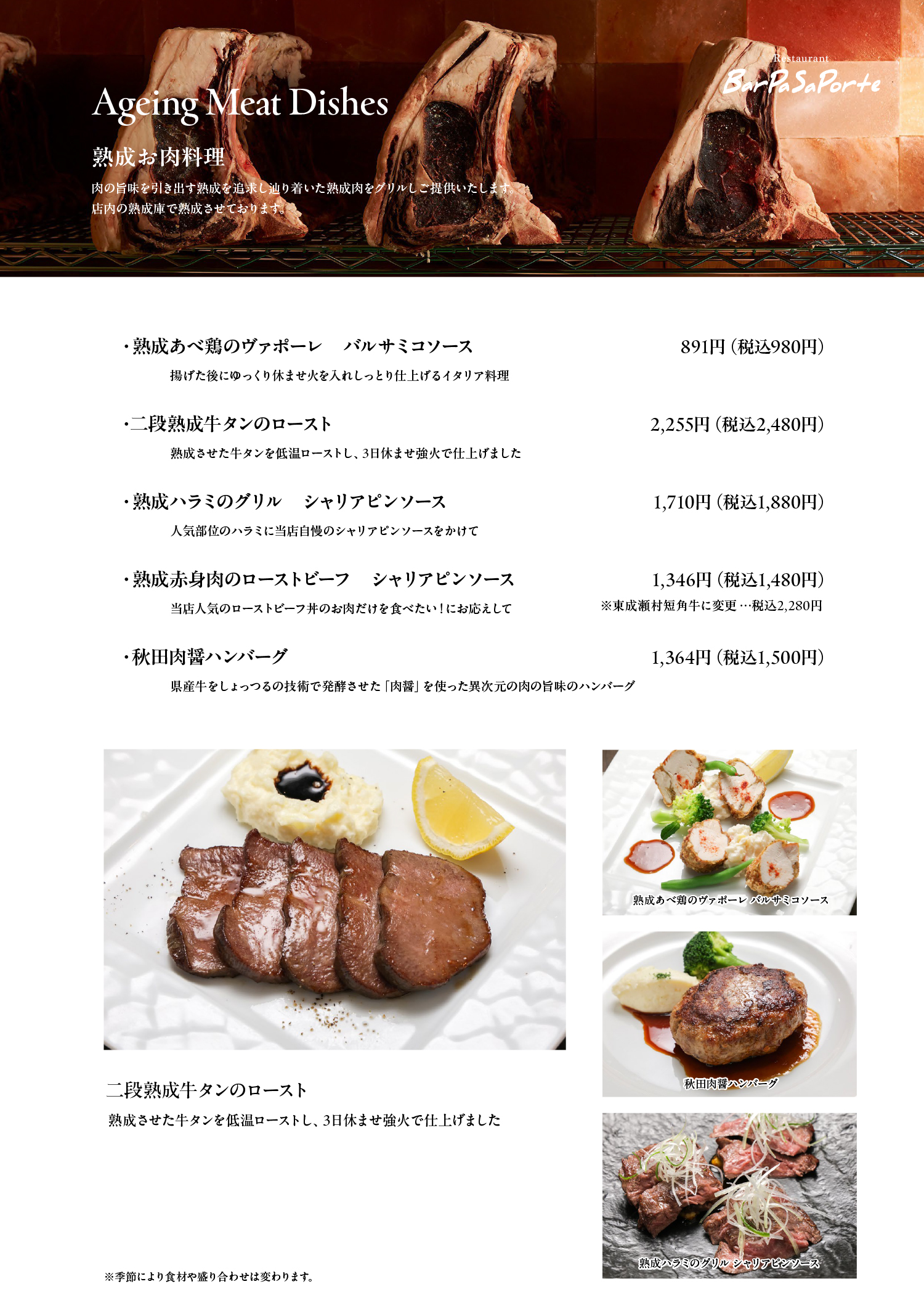 使用するのは、秋田県東成瀬村で育てられた希少な「短角牛」。この上質な赤身肉を自社で丁寧に熟成し、Tボーンカットで豪快に焼き上げてご提供しています。熟成の旨みが凝縮された、ここでしか味わえない特別な一皿です。